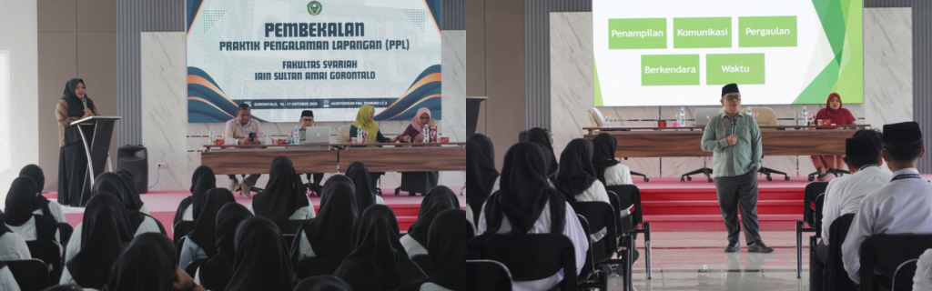 GORONTALO (IAINSAG) – Fakultas Syariah (FS) Institut Agama Islam Negeri (IAIN) Sultan Amai Gorontalo menggelar kegiatan Pembekalan Praktik Pengalaman Lapangan (PPL) yang berlangsung selama dua hari pada 16 – 17 Oktober 2025, di Aula Fakultas Syariah Kampus 2 IAIN Sultan Amai Gorontalo. Kegiatan ini dihadiri oleh Dekan FS, Prof. Dr. Ahmad Faisal, M. Ag. yang didampingi oleh Wakil Dekan I, Dr. Darwin Botutihe, M. H., Wakil Dekan II, Dr. Selviyanti Kaawoan, S.Ag.,M.HI., serta Kepala Bagian (Kabag) Dra. Asria Mahmud, kamis (16/10/2025).