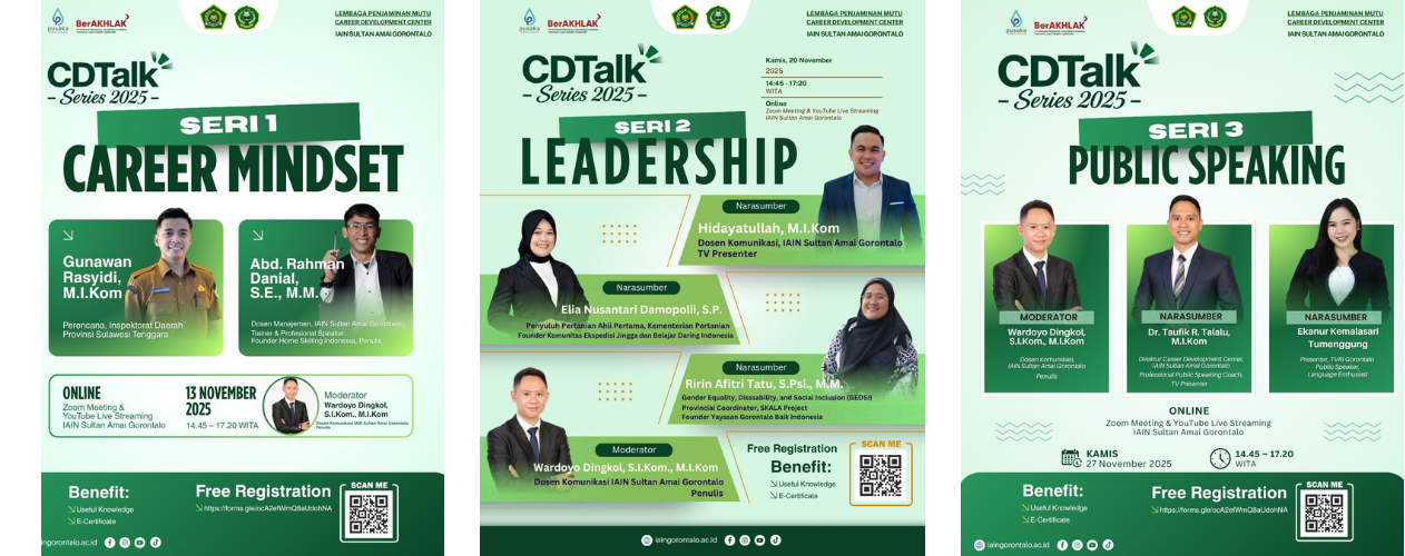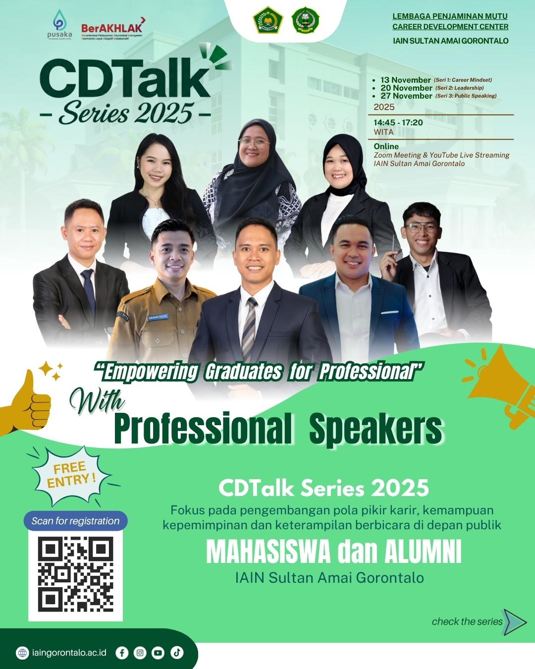 GORONTALO (IAINSAG) – Career Development Center (CDC) IAIN Sultan Amai Gorontalo bersama Lembaga Penjaminan Mutu (LPM) secara resmi meluncurkan CDTalk Series 2025, rangkaian program pengembangan kapasitas mahasiswa dan alumni melalui tiga seri utama: Career Mindset, Leadership, dan Public Speaking. Kegiatan ini digelar pada 13, 20, dan 27 November 2025 secara online melalui Zoom Meeting dan Youtube Live Streaming IAIN Sultan Amai Gorontalo.