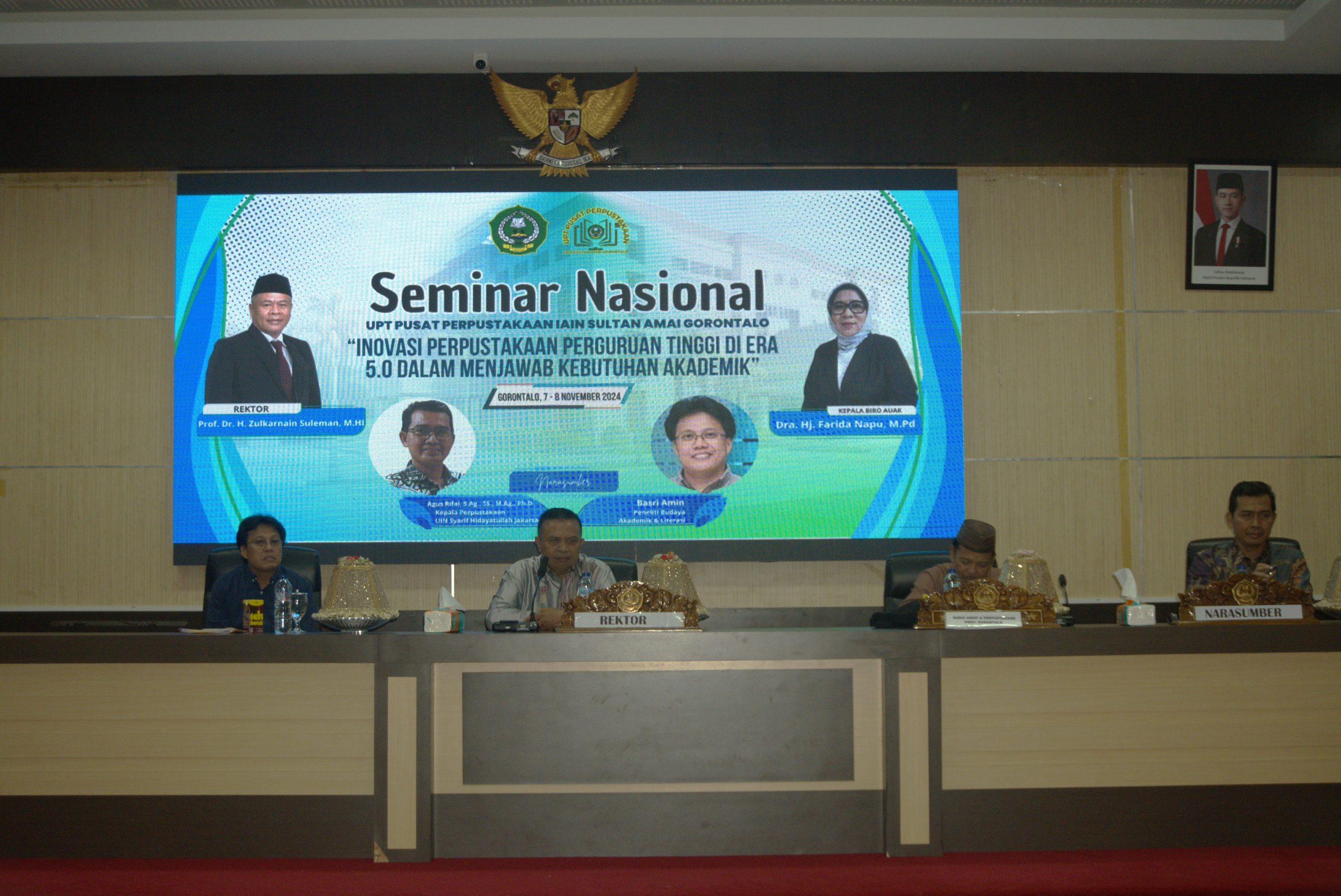 GORONTALO (IAINSAG) – Unit Pelaksana Teknis (UPT) Pusat Perpustakaan Institut Agama Islam Negeri (IAIN) Sultan Amai Gorontalo menggelar Seminar Nasional yang berlangsung di Auditorium Gedung Rektorat Lantai IV IAIN Sultan Amai Gorontalo, Kamis (07/11/2024).