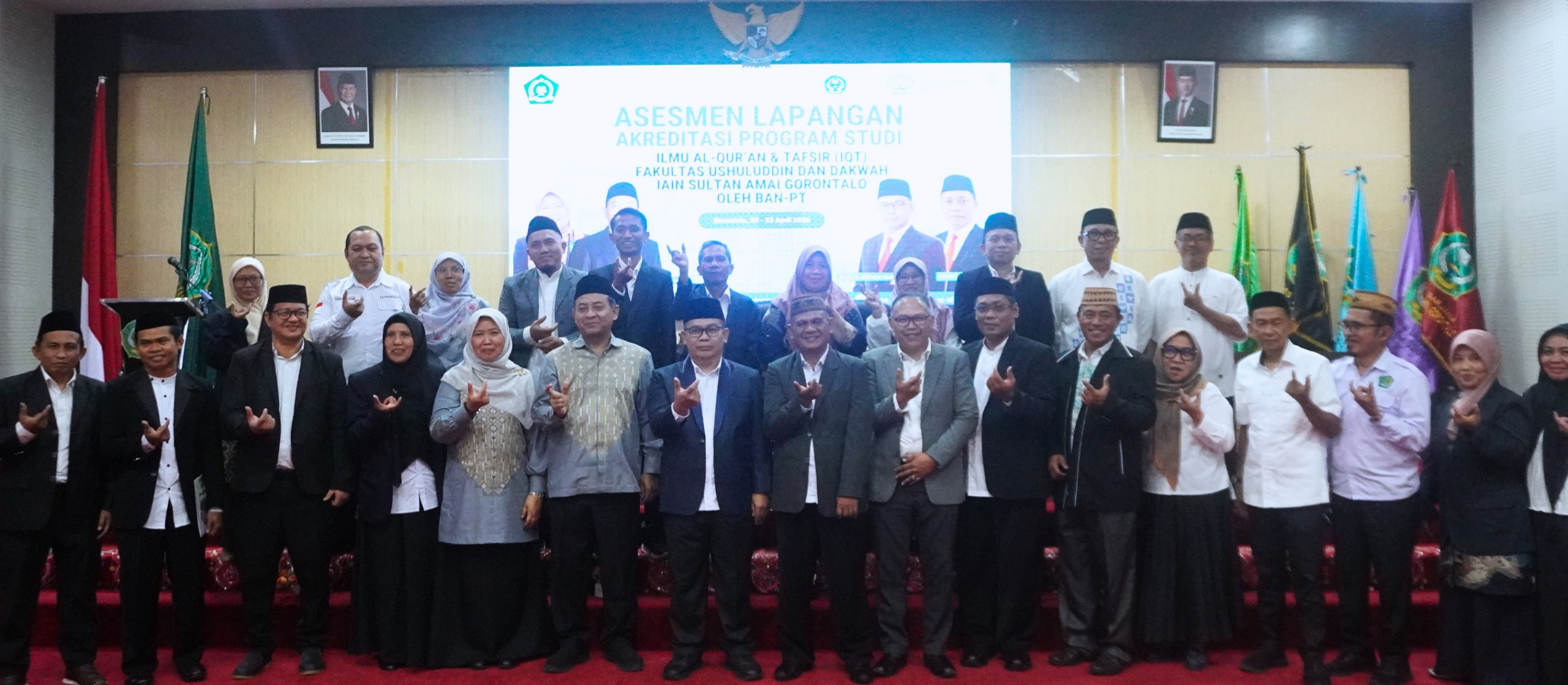 GORONTALO (IAINSMART) – Program Studi (Prodi) Ilmu Qur’an dan Tafsir (IQT), Fakultas Ushuluddin dan Dakwah (FUD), Institut Agama Islam Negeri Sultan Amai Gorontalo (IAIN SMART), melaksanakan asesmen lapangan oleh Badan Akreditasi Nasional Perguruan Tinggi (BAN-PT). Kegiatan ini berlangsung di Auditorium Gedung Rektorat Lantai IV, Kampus I IAIN SMART, Selasa (21/04/2025).