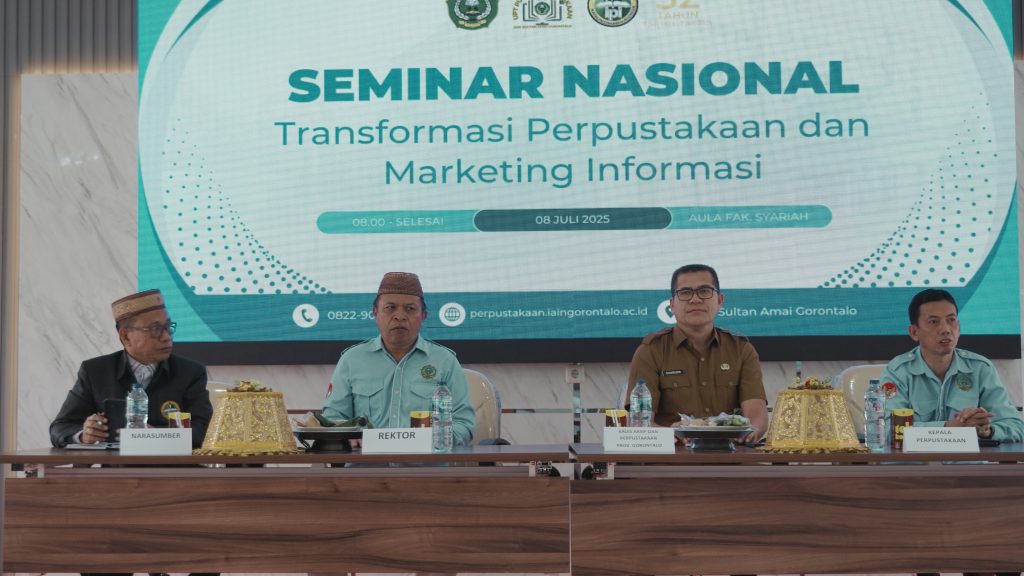 Gorontalo (IAINSAG) – UPT Pusat Perpustakaan IAIN Sultan Amai Gorontalo menyelenggarakan Seminar Nasional bertajuk “Transformasi Perpustakaan dan Marketing Informasi” bertempat di Auditorium Fakultas Syariah Kampus II IAIN Sultan Amai Gorontalo dengan menghadirkan narasumber yakni Prof. Imas Maesaroh, M.Lib., Ph.D. dan Yusron Humonggio, M.Pd.. Selasa (08/07/2025)